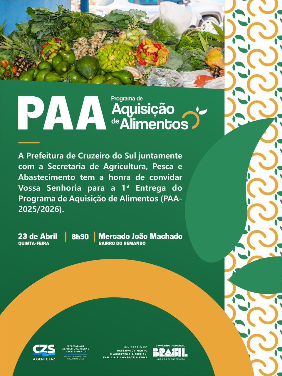 (Assessoria) – A Prefeitura de Cruzeiro do Sul realiza na próxima quinta-feira (23), às 8h30, a primeira entrega do Programa de Aquisição de Alimentos (PAA) 2025/2026. A ação acontecerá no Mercado Municipal João Machado, no bairro Remanso, e marca o início da distribuição de alimentos provenientes da agricultura familiar para entidades assistenciais do município.